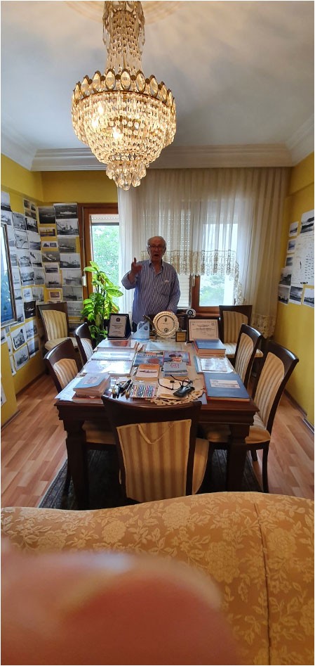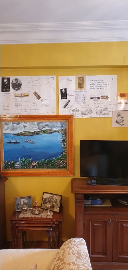 – Refik Ağabey bu duvarda ise, 2. Dünya Savaşı’nda Yunanistan’a yaptığımız yardımları taşıyan gemilerimizin haritasını yapmış. “Ben o sırada Trabzon Lisesınde okuyorum.Devlet bana sadece 150 gram Mısır ekmeği veriyor,açlıktan çalışamıyorum ama Yunanistan’a insanlık yapıyoruz. Bütün gemilerın gerçek fotoğraflarını çıkarttım. Haritayı ise ben çizdim. Unutulmasın istiyorum. Bu eseri İngilizce ve Rumca yayınlayalım ki, insanlar bizim kim olduğumuzu anlasınlar. Ege’de Alman gemileri cirit atarken bu kadar gemi Yunanistan’a gıda yardımı yapıyor. Bu büyük bir kahramanlık örneği.”