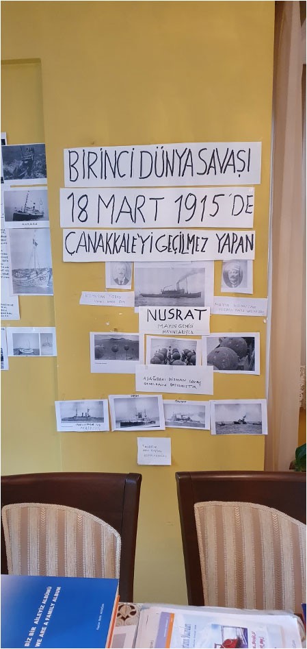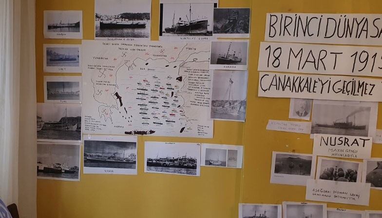 – Nusrat Mayın Gemisi için yaptığı köşeye gelince heyecanlanıyor Refik Ağabey, “Burada iki kahraman var” diyor ve devam ediyor. “Kahramanlardan biri geminin kaptanı ve diğeri ise mayın komutanı. Bunlar büyük kahramanlar.” Altındaki fotoğraflar ise Çanakkale’de denizin dibine yolladığımız gemiler ve mayınları.
