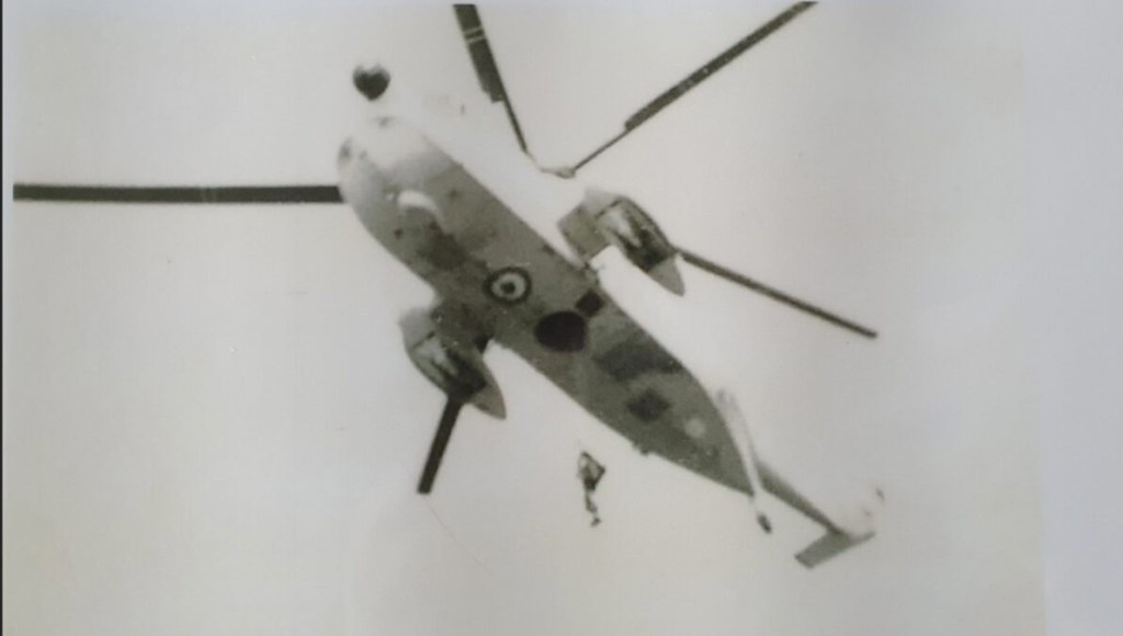 Havada bir helikopter öbür sandaldan bir kişiyi tel halatla yukarı çektnğini gördük. Ama o kişi helikoptere ulaşamadan 20-25 metreden düştü.Allahtan sandalın içine değil denize düştü. Ama deniz de pek güvenli sayılmaz. Bilindiği üzere o denizler köpek balığı ile kaynar. Neyse ki bir vukuat olmadan o kişi filikaya dönebildi. Sonradan o kişi ile konuştum. Kamarotmuş. Neden düştün diye sordum. “ helikopter tepemize geldi. Ucunda bir demir halka olan tel alatı aşağıya sarkıttı. Helikopterin şiddetli rüzgarından olsa gerek halka bir o yana bir bu yana sallanmasın diye halkayı tuttum. O sırada helikopter beni yukarı çekmeğe başladı. Rüzgarın şiddeti ile savrulan su çırpıntıları yüzünden hem demir halka ,hem de benim ellerim sırılsıklam ıslanmıştı.Çekme de sarsıntılı olduğundan halka ellerimin arasından kaydı ve ben düştüm.