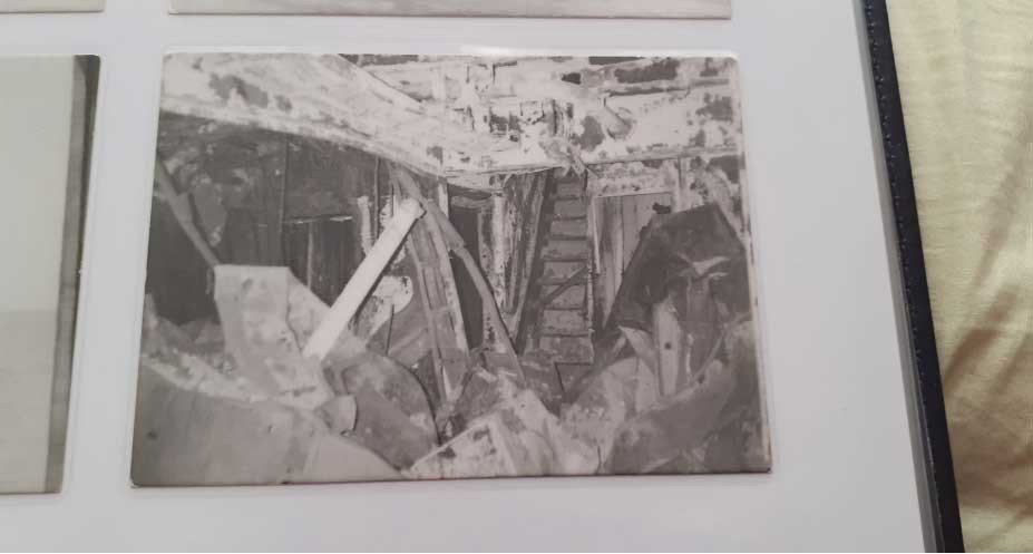 Patlamanın sersemliği geçince “eyvah Kemal aşağıda kaldı deyip, geldiğim yoldan geriye fırladım. Zabitan yaşam bölümüne daldım. Hemen solda mürettebat katına inen merdivenlere yöneldim. O sırada yukarı kata çıkan merdivenin yanındaki Mk.perdesi parçalanmış, mk. dairesinin içinde kalın bir alev sütunu gördüm. Mürettebat sahanlığına indim. Dumandan göz gözü görmüyordu. El feneri ışığı dumanın içinde kayboluyor ve hiç bir işe yaramıyordu. Ancak yere bakınca aşağılarda duman seyrekleştiği için yerleri görebiliyordum. Kamaraların kapıları yerlerinden kopmuş, kamaraların içindeki bütün eşyalar sahanlığa fırlatılmış olup yürümeği zorlaştırıyordu. Bu mezbeliği aşağıdaki fotoğrafta görmek olanaklı.