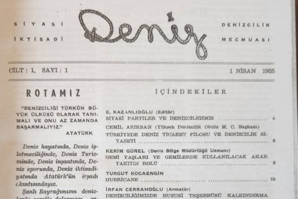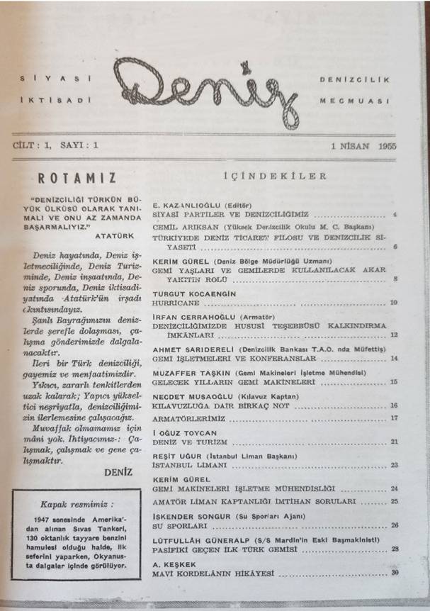Editör olarak E .Kazanlıoğlu gözükmekte, yazar kadrosunda, Cemil Arıksan (Yüksek Denizcilik Okulu Mezunlar Cemiyeti Başkanı),Kerim Gürel (Deniz Bölge Müdürlüğü uzman),Turgut Kocaengin, İrfan Cerrahoğlu (armatör), Ahmet Sarıdereli (Denizcilik Bankası T.A.O ‘nda müfettiş), Muzaffer Taşkın (Gemi Makineleri İşletme Mühendisi), Necdet Musaoğlu (Kılavuz kaptan), Oğuz Toycan, Reşit Uğur (İstanbul Liman Başkanı), Kerim Gürel (Gemi Makineleri İşletme Mühendisi), İskender Songür, Lütfullah Güneralp (S/S Mardin’in Eski Baş Mühendisi) ve A.Keşkek yer almaktadır.
